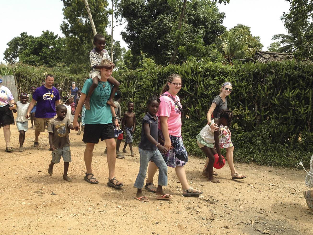 Even the goats ride motorcycles hereAfter learning about the program and naming the goats, our team left the compound to deliver them. As soon as we passed through the gates, our number doubled as neighborhood children joined us. Any free hand was quickly taken by another young, sweet (and sweaty!) hand. Christi and her motorcycle led the pack of goats, volunteers, and neighborhood children. To make the journey easier for the goats (and very memorable for us), each goat had a turn riding the motorcycle on the lap of a volunteer.